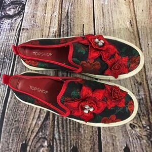 Women’s embroidered embellished flower slip on 🌹Tessa, by topshop 🌹 EUC 🌹 worn maybe twice, just don’t have enough to wear with these so they sit 🌹 run small 🌹 bottom of the sole measures approx. 9.5” 🌹 red and navy blue