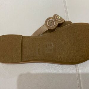 women's flat sandals. These sandals are designed with a thong style, featuring a decorative embellishment of circular beads or stones along the strap.
