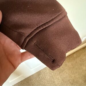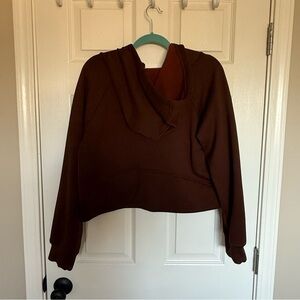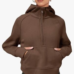 Stylish brown half-zip hoodie with a front pocket and thumbholes. Perfect for casual wear.