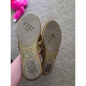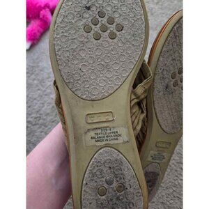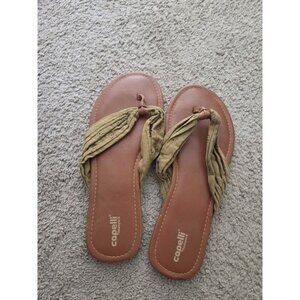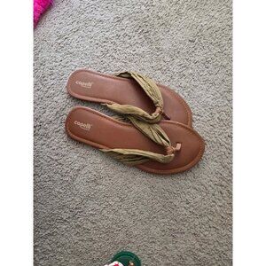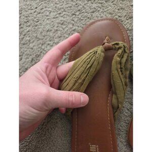 Adorable leather flip flops with crochet knit material in green. Size 9.