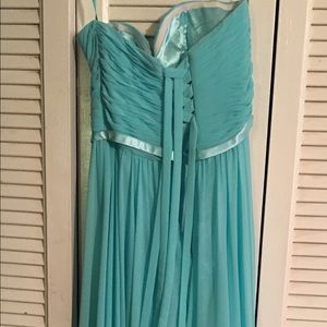 Item was worn one time to a military event. Sweet heart neck with lace up backing. It was hemmed to fit right with my shoes, I am 5'0, and wore this with 6 inch heels and it was made to be floor length according to those measurements. Dry clean only.