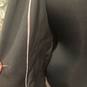 Women’s black blazer from gap size 12. Has a pink thin trim inside with one button closer in the front. The blazer has “pockets” in the front that don’t open/not usable.