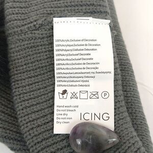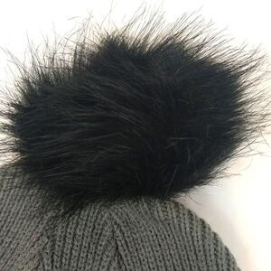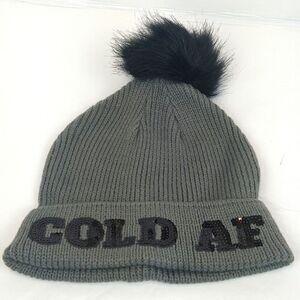 Women's gray knit beanie with black sequin letters and faux fur pom