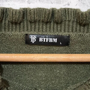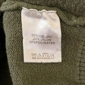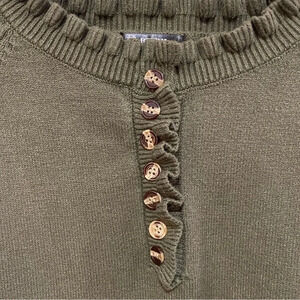 Women’s. BTFBM. Green sweater. 1/4 button down neck with ruffles. Preowned condition. No stains/tears. Size Large.