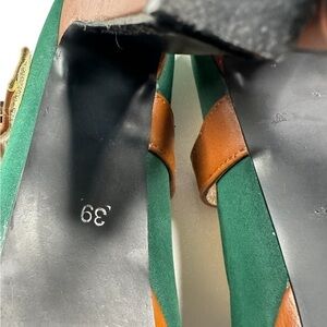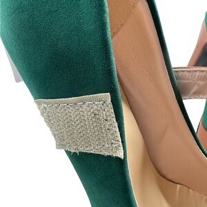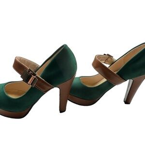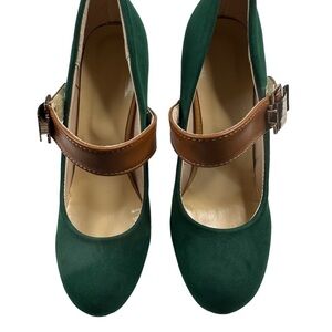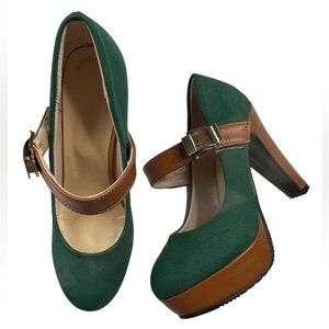 Women's forest green Round Toe Platform Pumps Chunky High Heel Buckle size 39. Velcro brown closure with gold buckle. Some cracking in the inside of strap and scratches on buckle, see photos. Heels approx 3.5”
