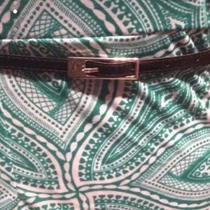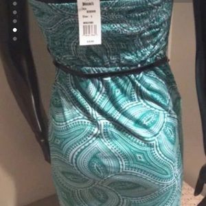 Derek Heart strapless dress with softly molded cups, a novelty print, and a black buckle belt to complete the look (can be worn with or without the belt) This pullover dress measures 34 inches from chest to hem. 95% Polyester, 5% Spandex. Machine wash. Tumble dry. Color looks slightly different in the picture than it does in person. It is more of a green color than a teal or turquoise.