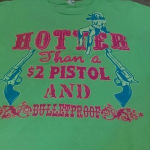 "Hotter than a 2 dollar pistol and bulletproof" neon green medium fits more like a small