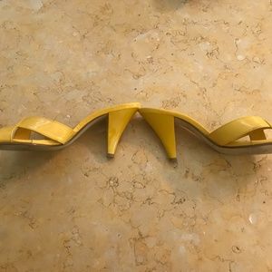 Easy on, easy off! Sunshine yellow backless sandals for your summer fun! Almost perfect. Shiny sheen look like patent leather but manmade materials. Will make an outfit shine!