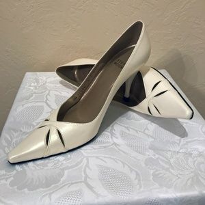 Stuart Weitzman 5 & 1/2 M stiletto heels in pearlized white leather. The heel height is 3 &1/2 inches. The soles are of leather and the inner sole is lightly padded for comfort. An extremely pretty shoe. Never worn.