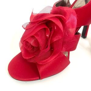 These shoes are new owned by me and never worn. The shoes are beautiful and the color may be described as a hot Red. The stunning flower in the front is made with two different materials. One is a mesh material and the other is an irdesent material that pick up the light as you walk. The shoes are a size 8 1/2 M and the heel is 4 1/2" hi from the ground to the top of the shoe. It has come time for me to pass them to another Diva that will enjoy them.