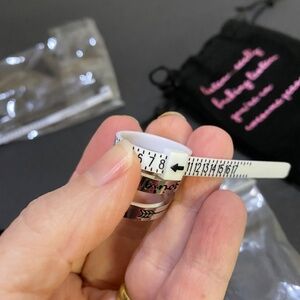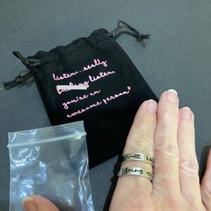 Bought these for my daughters and they didn't want them...so maybe someone else can use them:) Never worn. Size 8 loose fit, pls see pictures. I am not sure if this can be adjusted? Might be able to squeeze for a slightly tighter fit, but I"m not sure. Didn't want to try it and mess up the rings. I have 3 of them, but am selling individually. Comes with black bag shown with verbiage on it and in clear plastic bag.
