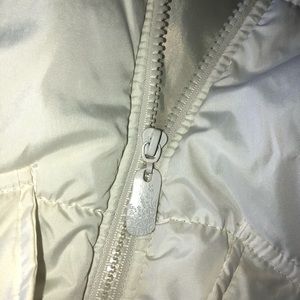 white puffer jacket with off-white sweater like sleeves and off-white fur hood. Worn less than a handful of times and in brand new condition