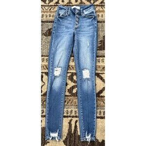 The product is a pair of women's juniors Kancan high-rise button fly ankle skinny jeans in size 0/23. These jeans feature a button closure, are in a stylish ankle length, and come in a classic blue color. Perfect for a trendy and fashionable look, these jeans are designed for a comfortable fit and on-trend style, making them a versatile addition to any woman's wardrobe. Perfect for casual everyday wear or dressing up for a night out, these jeans offer a flattering silhouette and timeless appeal.