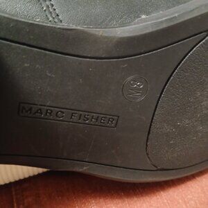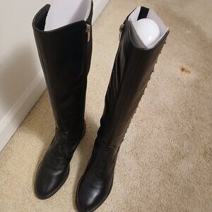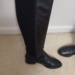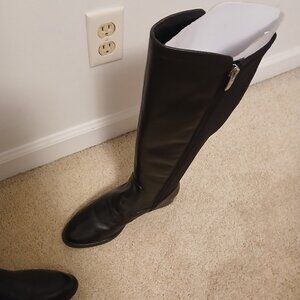 Knee high, black leather with suede by mark fisher, with zipper closure. And metal decorative brads.