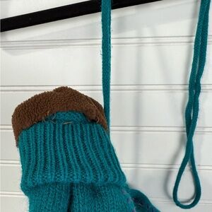 Women’s knit turquoise floral mittens on rope. Lined with brown fleece. The fleece is coming unstitched in one mitten (pictured) You’ll never lose these gloves, because these have a rope attaching them that you can string through the arms of your coat.