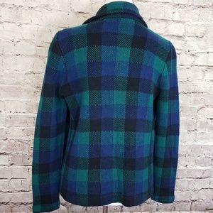 Beautiful green blue and black women's knitted jacket. Has a zipper that goes up the side under the zipper is a large flap to where you can have it halfway and zipped and still have the chest covered to stay warm. Hundred percent cotton. small/petite shoulder seam 16", chest 19" Length from base of neck 23", mid section 17" has plenty of stretch. large 17", chest 20", length 24" mid section 19" has plenty of stretch