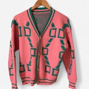 Stylish pink cardigan with green geometric patterns. Features a button-up front and striped trim. Perfect for the upcoming fall evenings.