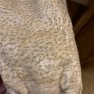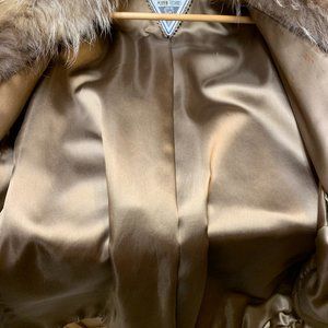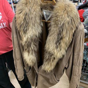 Women's size S overcoat with fox/coyote collar. Distressed leather pattern. Button closure. Acetate lining in great shape. No appreciable wear on coat. Color see picture-grayish brown . Leather Two hand pockets. Sleeves end in elastic cuffs Very nice
