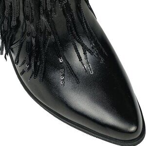 Women's leather-like thick-heeled western pointed booties Black tassels & sequin