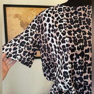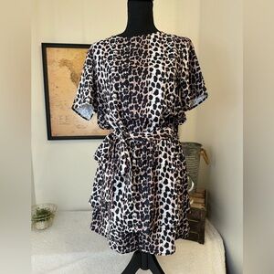 Women’s lightweight leopard romper. Size medium. Removable tie belt. Black, tan and white. New without tags.