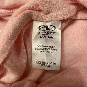 Women’s lightweight pink pullover hoodie with drawstrings, thumb holes & a crossover design at waistline. Size SMALL (4-6) 58% rayon 38% poly 4% spandex EUC Machine Wash cold. P2P 19 in length 25 in SFPF HOME