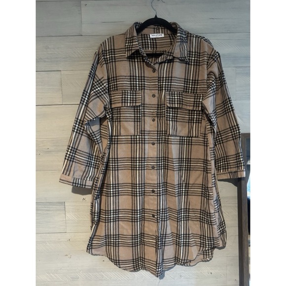 This Women's long plaid button-down shirt in size L features a stylish brown and black color combination, perfect for a casual occasion. With a classic collared neckline, long sleeves, and button closure, this shirt offers a comfortable and regular fit. The wide strap adds a touch of accent to the overall design, making it a versatile piece for the spring season. The shirt is machine washable for easy care and is not vintage or handmade, offering a modern and practical addition to any woman's wardrobe.