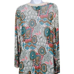 Vibrant bohemian style. Long sleeves. Button-down front. Perfect for layering.