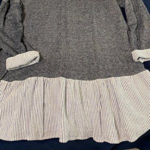 Women's long sleeved top. Has blue and white ruffle around the bottom of shirt.
