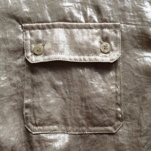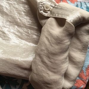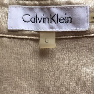 Women’s very festive, champagne colored two-pocket Calvin Klein blouse w/tabs for securing rolled sleeves (see photo). Size L. Worn once; no pulls. Excellent condition. 100% poly. Hand wash only.