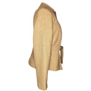 Women's lsabella Tan Tie Blazer, Size 16. Tan in color, with matching lining. Four buttons down the front. It has a mandarin type collar and two attached straps at the waist to pull tight and tie for a more fitted look. 100% Polyester. Excellent condition, no flaws or wear.