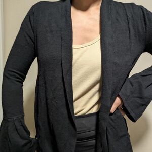 women's medium open Black cardigan with bell sleeves. Thick soft fabric. No fasteners or buttons. Great addition for your Morticia Addams costume. #bellsleeve #fallfashion #whimsygoth #gothfashion #halloween