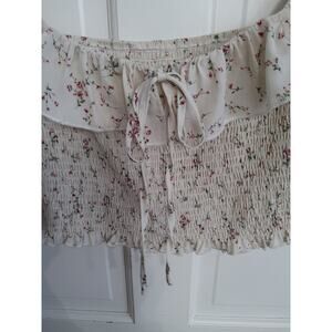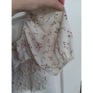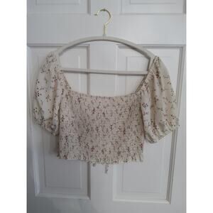 No brand tag, Womens cream colored milkmaid crop top with ruching Size medium cream ruffled around the waist bow in front, it can be worn off shoulder half sleeves are ballooned and sheer cute floral pattern. Very romantic boho nature or hippie vibe perfect for vacation and in good condition pre-owned condition. See photos for extra description