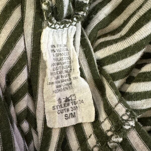 This is a pre-owned Mitto Shop striped top, size S/M. The shirt features horizontal stripes in olive green and white. It has a round neckline and three-quarter length sleeves. The material is a blend of 95% rayon and 5% spandex. The shirt is in good condition with no visible stains, tears, or other imperfections. The style number is T6424 and the cut number is 351.
