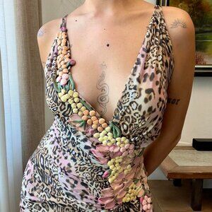 Vintage Early 2000’s Y2K Style Ema Savahl Couture asymmetrical dress — a rare, sculptural piece with a bold mixed animal print and hand-applied 3D embellishments with a few rhinestones along the neckline and bodice. Designed with a deep V front, soft stretch mesh that hugs the body, and a floaty asymmetrical hem that moves beautifully. Fully lined for comfort. Truly a standout, art-to-wear designer piece.