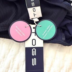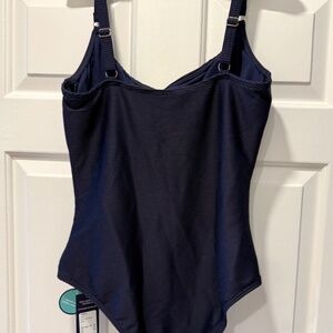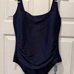 Never worn one piece contemporary and classically styled fully lined, rib textured swimsuit. Adjustable straps, removable pads, very comfortable tummy control and shirring in the front. Elastic under bust suitable for A to DD cups. Nylon, Spandex, Polyester.