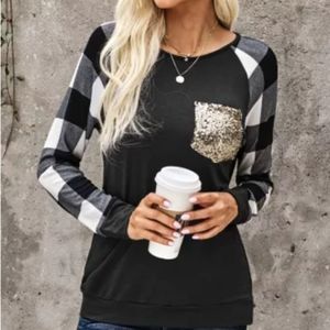 Black & white plaid long sleeve tee with a gold sequins pocket. Very cute and perfect for fall 😍
