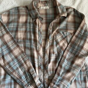 Women’s plaid flannel Tag says size small/medium but fits more like a true size small Great condition no flaws mix of blue, brown, and cream colors.