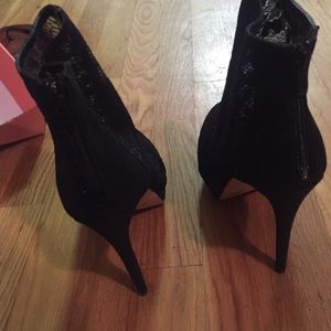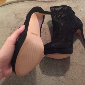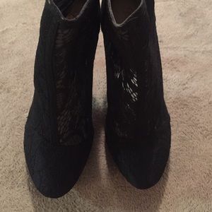 Platform lace booties. Synthetic material. Super tall! Approx 5 inch stiletto heel with 1 inch platform. Zipper on heel. Rounded toe. Back material is solid with a sheen. Purchased from Akira.