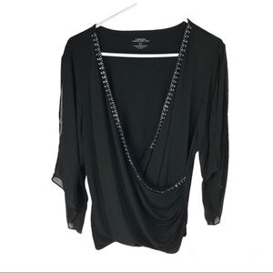 Women’s plus 2X carmen marc valvo V-neck wrap top black rhinestone , butterfly sleeves , faux wrap top