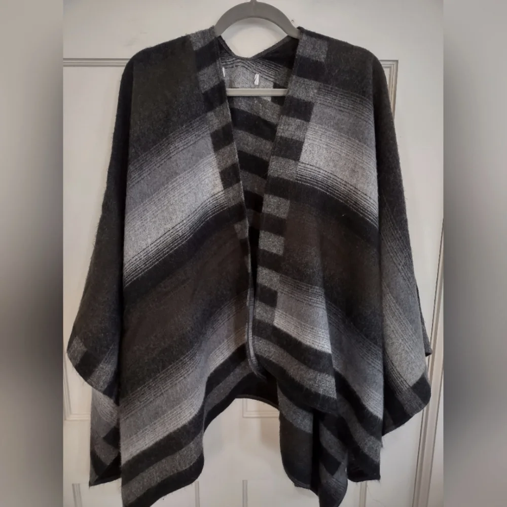 Black, gray and white acrylic sweater poncho/cape.