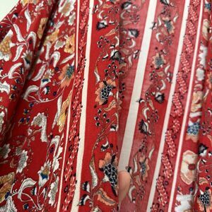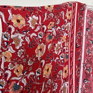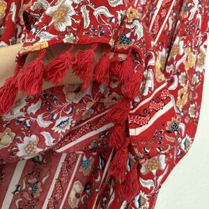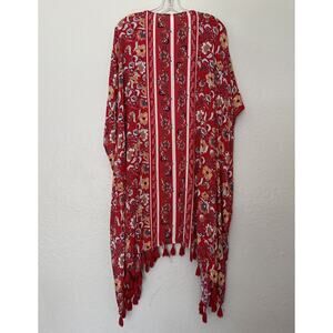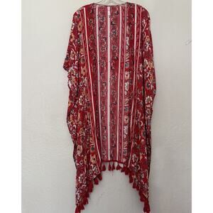 This beautiful women's cardigan is perfect for any bohemian-inspired outfit. The red floral pattern adds a touch of elegance and the long sleeves with kimono sleeves provide a comfortable fit. The V-neckline and fringe accents give it a unique and stylish look.