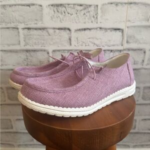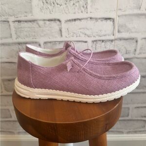 Women’s. Slip on shoes loafers sneakers. Light purple with white soles. Very lightweight. Hey Dude dupes. So cute. Very gently work. Size 7.