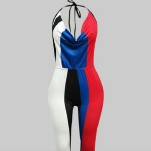 Women's Basic colorblock Backless halter neck red, blue, white, and black 1pc Jumpsuit. Sizes S and XL. New Without tags.
