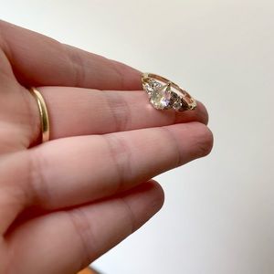 A gorgeous ladies ring from fragrant jewels, never worn. I believe it is a size 9 but I measured it with a ruler (see photos) if that helps. The main cz stone is clear and seems to reflect a rainbow of colors! The band is a gold color.