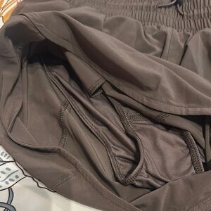 Lightweight and comfortable ladies running shorts. Have liner, pockets, elastic drawstring. Color is a dark taupe. Have multiple sizes- small and XXL.