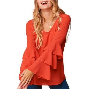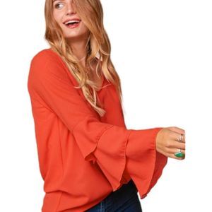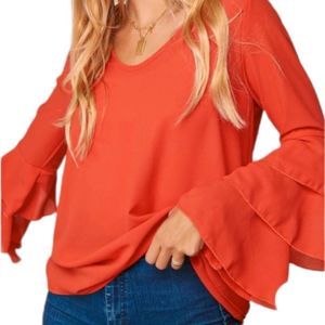 Rust red V-Neck long sleeve crepe woven blouse. Layered bell sleeves.