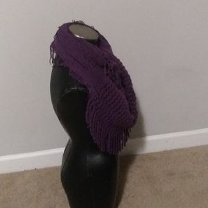 It's purple in color it's 28in long it is sold on one side on the other it has a material made with holes in it and it has fringe's all around it.