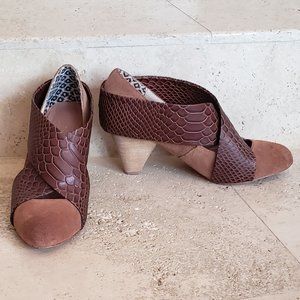 3.25" wooden heel. Very gently worn, in excellent condition.