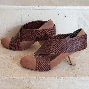 Tan suede Matt Bernson pump with wrap around croc-embossed leather strap detail.