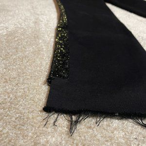 Jeans are crafted of black stretch cotton-blend denim distressed with raw-edge high-low hems